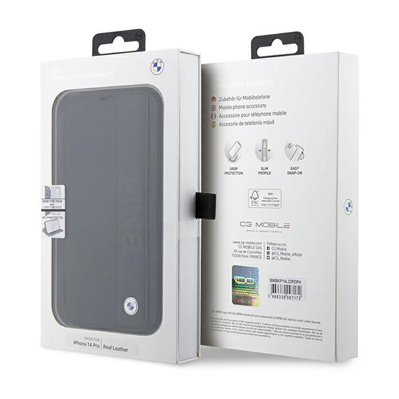 BMW knygos tipo odos tekstūros ir juostelės - dėklas, skirtas iPhone 14 Pro Max (juodas)