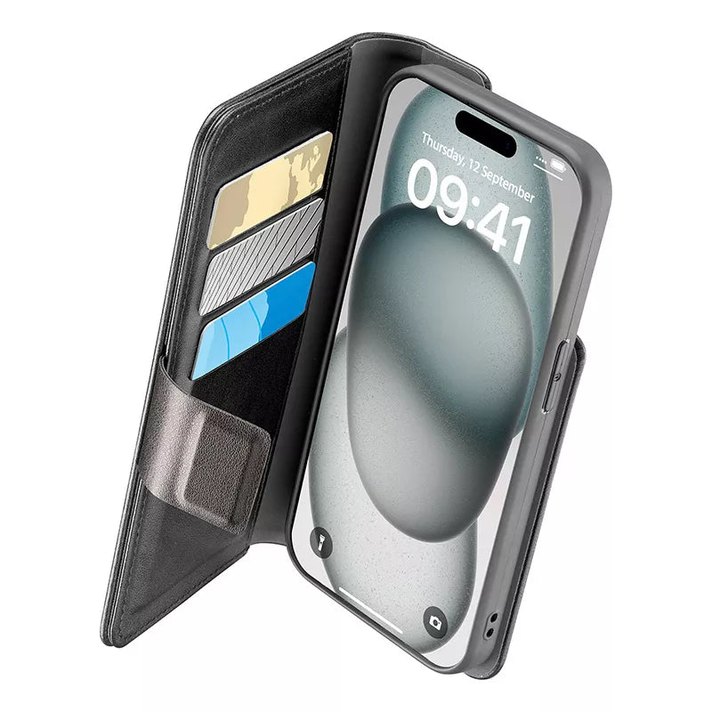 Cellularline Book Agenda – „iPhone 15“ dėklas su „MICROBAN“ danga (juodas)