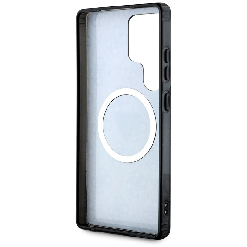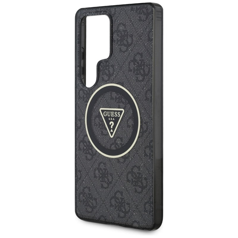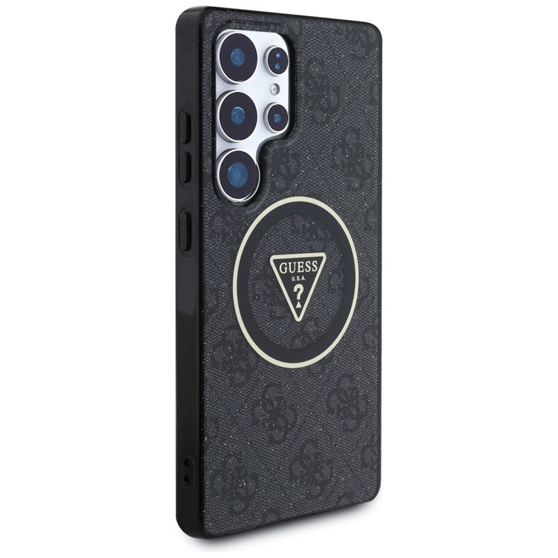 Guess 4G blizgūs trikampio formos mygtukai MagSafe – dėklas, skirtas Samsung Galaxy S25 Ultra (juodas)