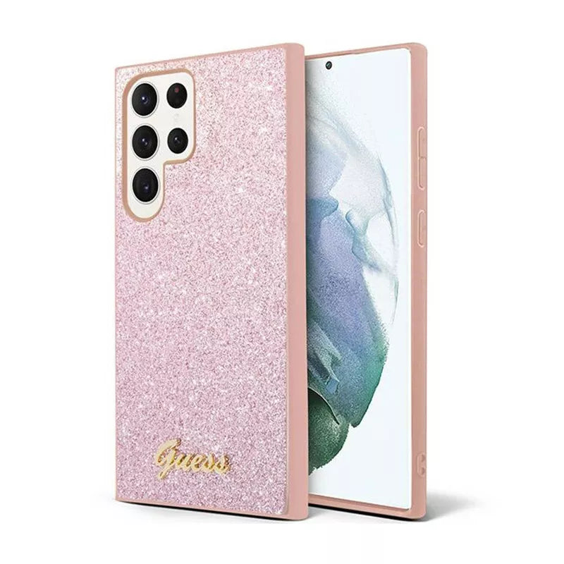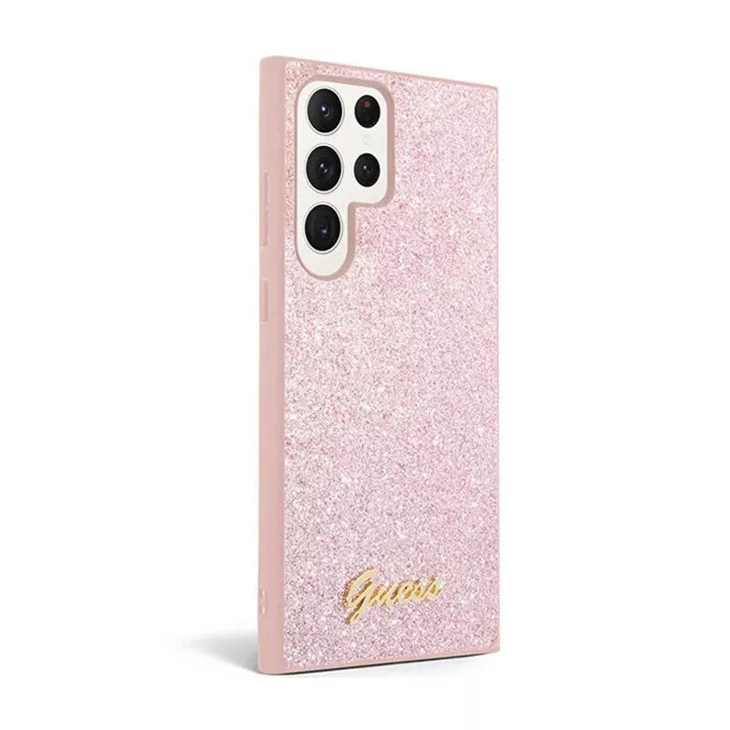 Guess Blizgučių dalelių metalinio logotipo dėklas, skirtas Samsung Galaxy S24 Ultra (rožinis)