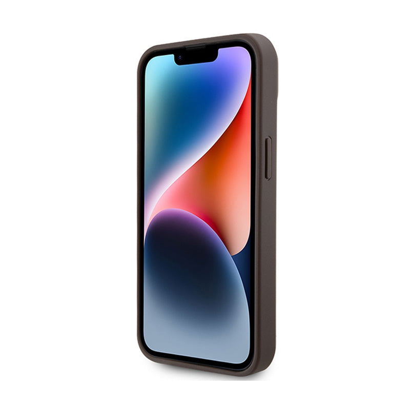 Guess Crossbody 4G metalinis logotipas – iPhone 15 dėklas (rudas)