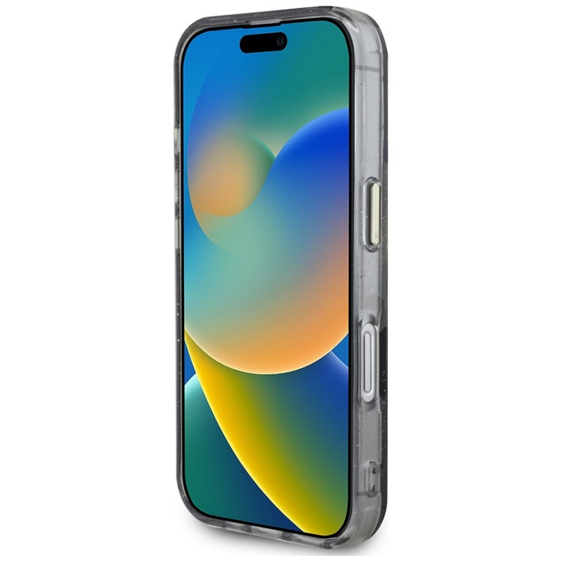 Guess Glitter Flowers Triangle Buttons MagSafe – dėklas iPhone 16 (juodas)