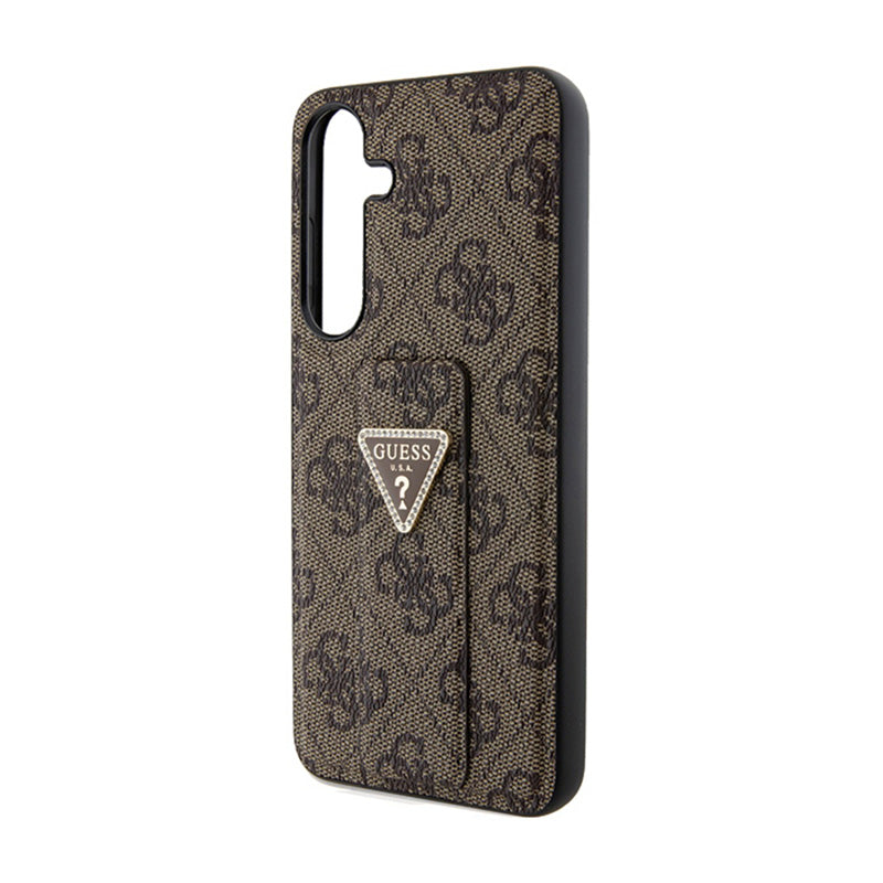Guess Grip Stand 4G Triangle Strass Logo – dėklas „Samsung Galaxy S24“ (rudas)