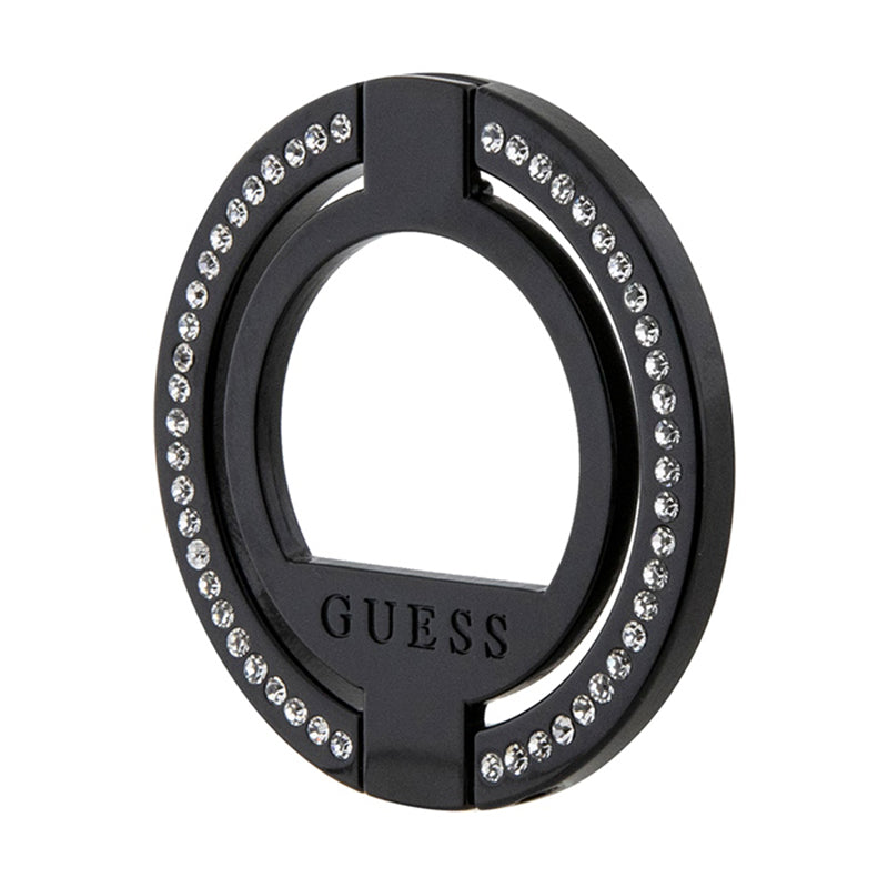 Guess MagSafe žiedo stovas su kristalais – magnetinis piršto laikiklis telefonui su stovo funkcija (juoda)