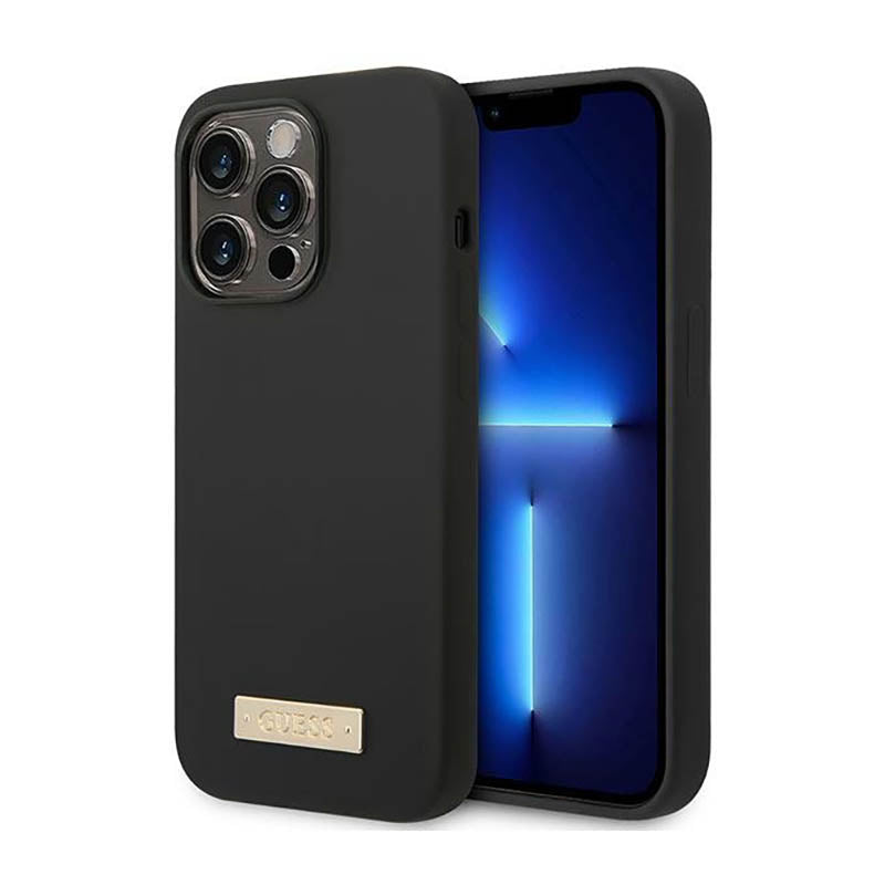 Guess Silicone Logo Plate MagSafe – dėklas, skirtas iPhone 14 Pro Max (juodas)