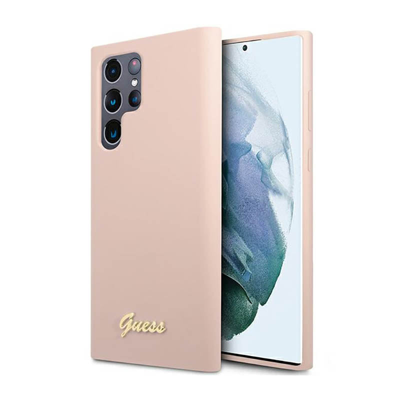 Guess Silicone Script Metal Logo - dėklas Samsung Galaxy S23 Ultra (rožinis)