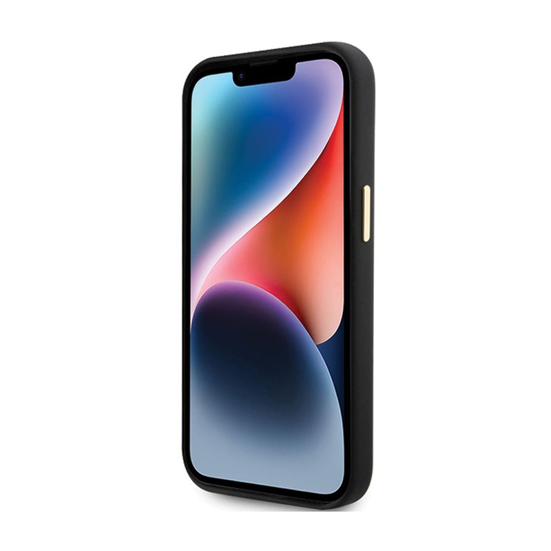 Guess Silikono Scrip with metal Guess logotipu ir rėmeliu - iPhone 15 dėklas (juodas)
