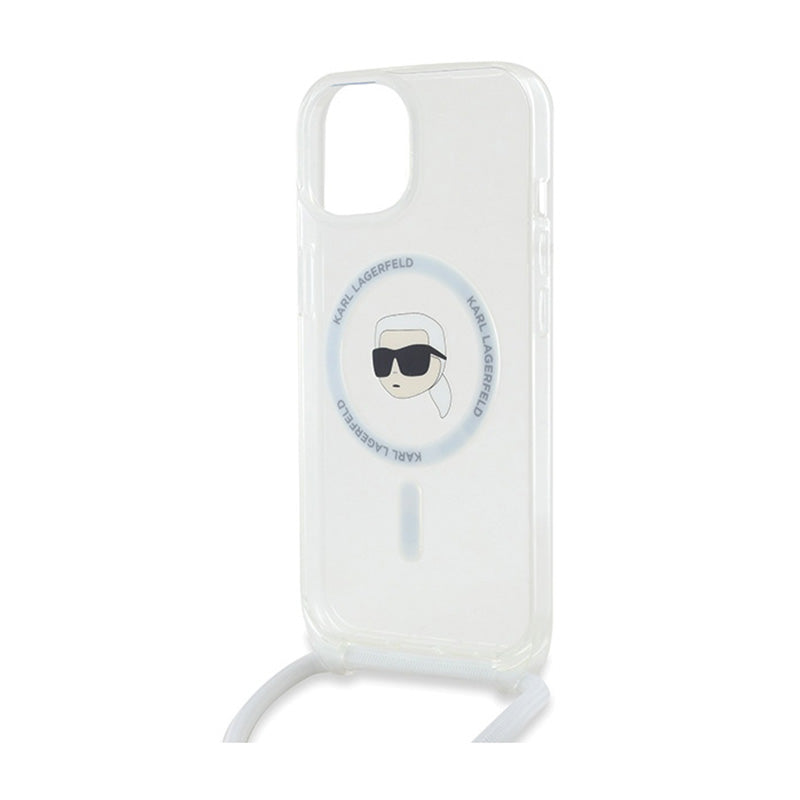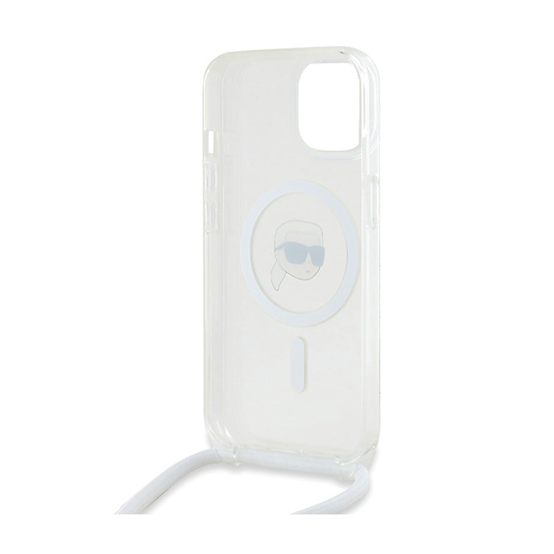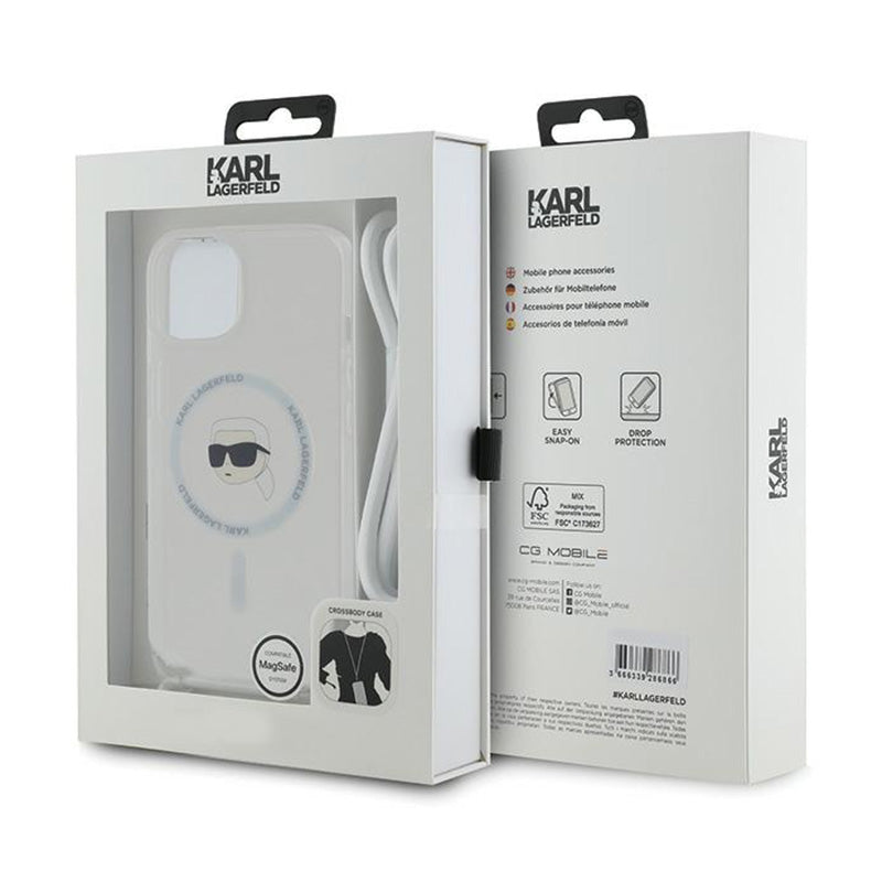 Karl Lagerfeld Skaidrus MagSafe per petį dėklas su IML Karl galva, skirtas iPhone 15 / 14 / 13