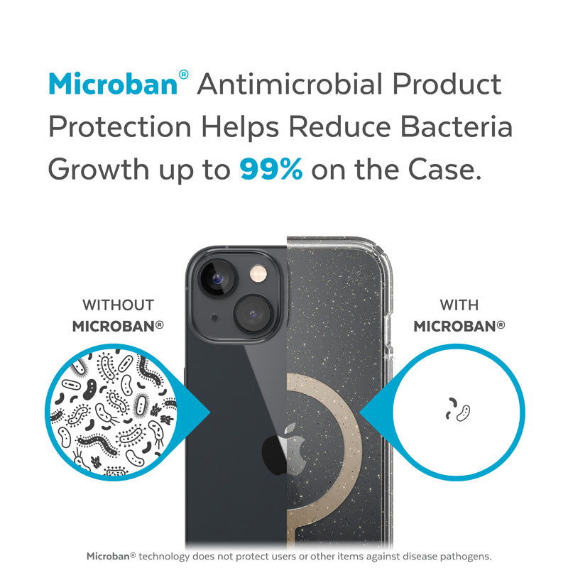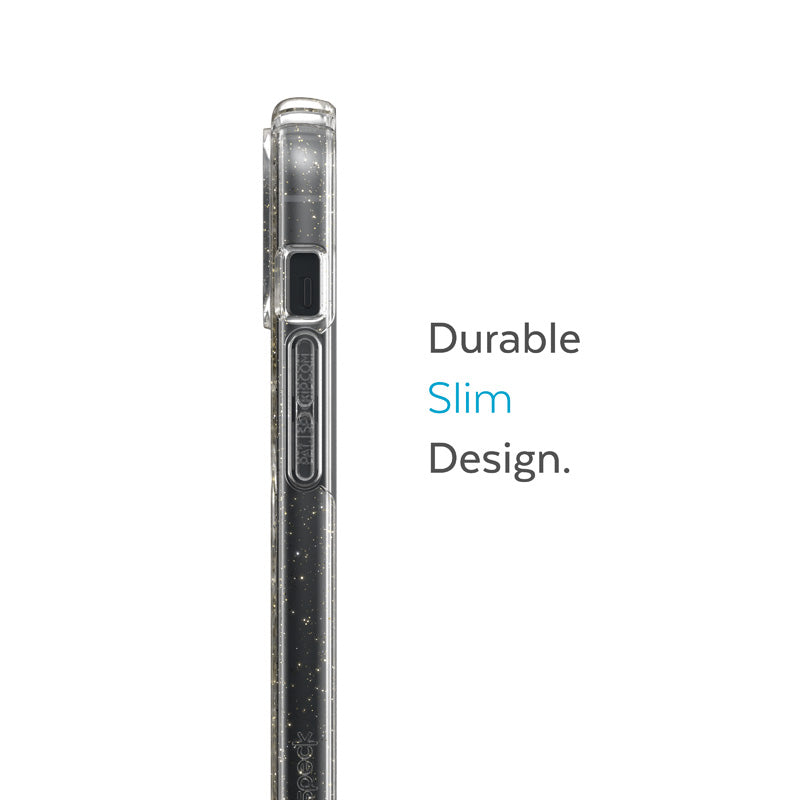 "Speck Presidio Perfect-Clear" dėklas su blizgučiais + "MagSafe" - "iPhone 15 Plus" / "14 Plus" dėklas su MICROBAN danga (skaidrus / su aukso spalvos blizgučiais)