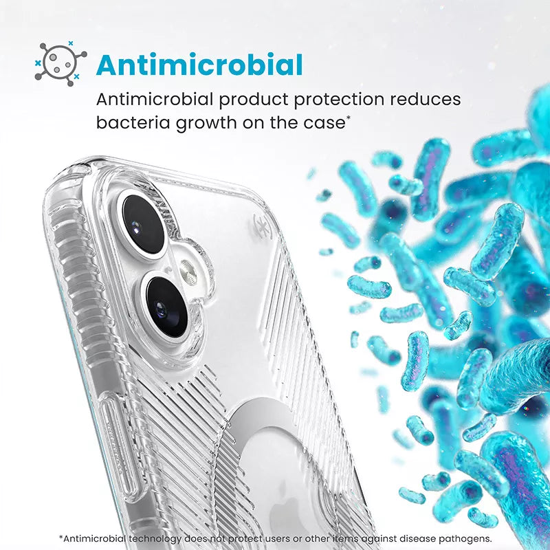 Speck Presidio Perfect-Clear Grip ClickLock & MagSafe – dėklas, skirtas iPhone 16 Plus (skaidrus / chromo apdaila / ramus sidabras)