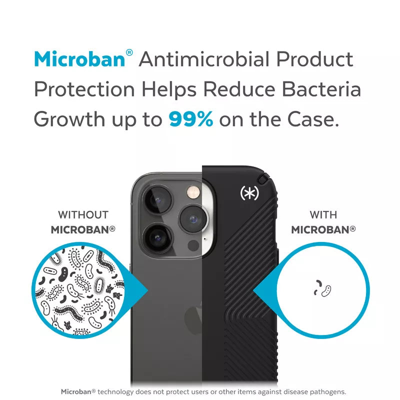 Originalus „Speck Presidio2 Grip“ apsauginis dėklas taip pat turi „MICROBAN®“ antimikrobinę apsaugą (pasaulinė antimikrobinių sprendimų lyderė, turinti platų daugiau nei 25 patvirtintų technologijų portfelį). Aktyvus ingredientas, įmontuotas į dėklo struktūrą, sustabdo 99% bakterijų, kurios kaupiasi ant dėklo paviršiaus. „MICROBAN®“ technologija užtikrina ilgalaikę apsaugą nuo dėmes ir kvapus sukeliančių bakterijų ir veikia ląstelių lygmeniu, kad dėklas būtų švarus.