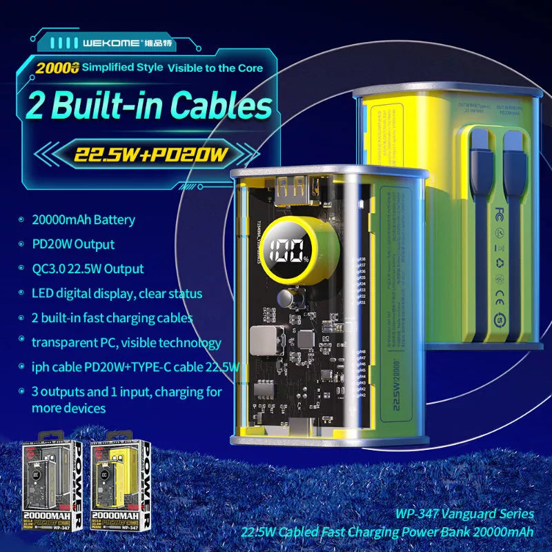 WEKOME WP-347 Vanguard Series – Power bank 20000 mAh ypač greitas įkrovimas su integruotu USB-C PD 20W & Lightning + USB-A QC3.0 22.5W kabeliu (juodas)