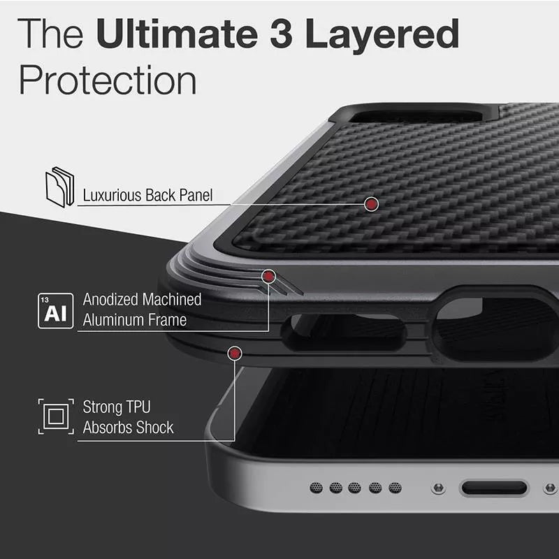 X-Doria Raptic Lux – aliumininis dėklas, skirtas iPhone 12 Pro Max (kritimo testas 3m) (juodas anglies pluoštas)